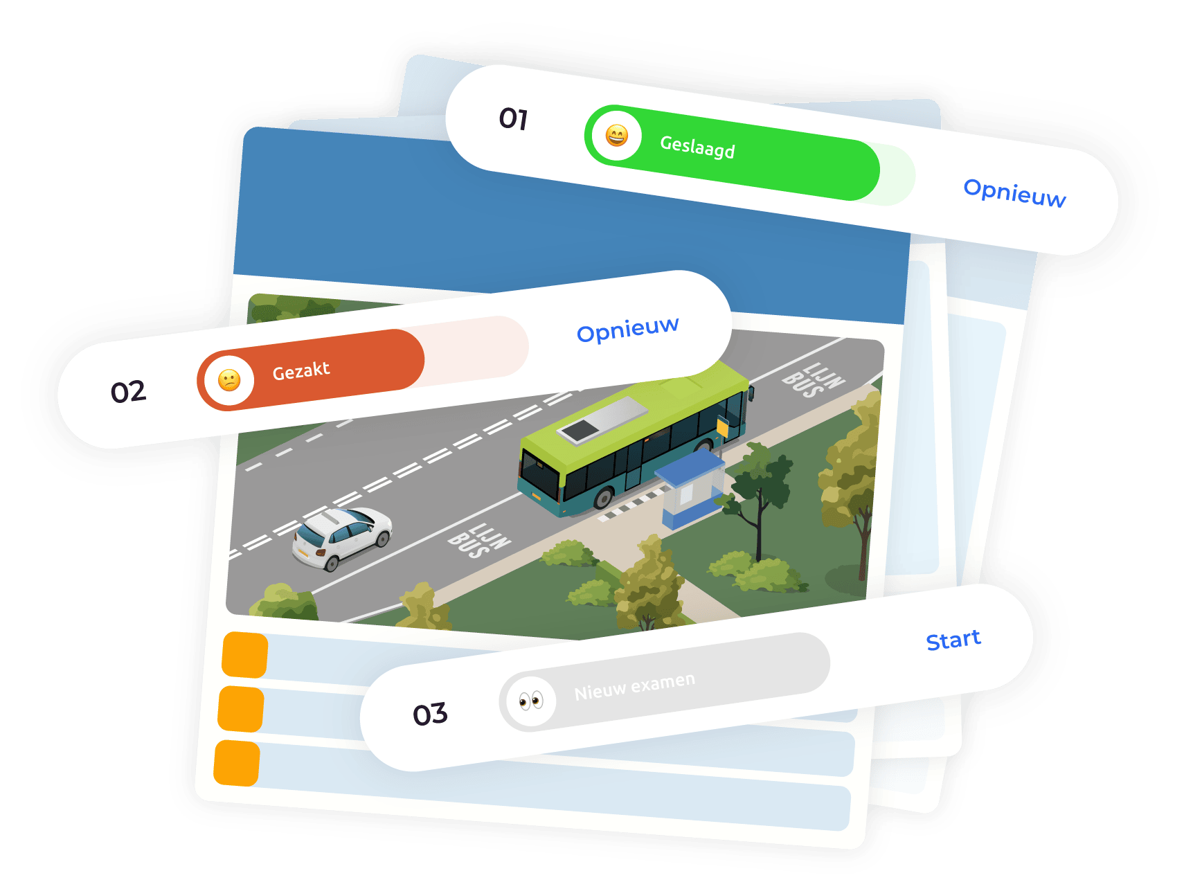 Slagen voor het theorie examen doe je met behulp van Theorie Toppers! Om te slagen voor het examen is het essentieel om goed te oefenen. Er zijn verschillende aspecten die aan bod komen tijdens het theorie examen. Om alles te begrijpen en om genoeg kennis te hebben voor het examen moet je nou eenmaal goed studeren. Wij bieden je een leuke en leerzame manier van oefenen.
