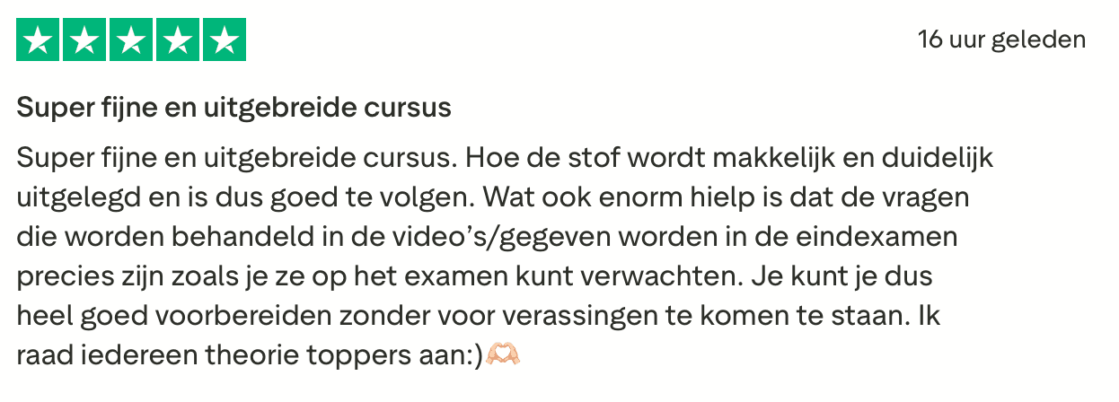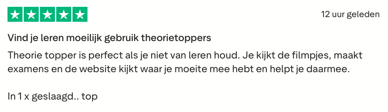 Het goede nieuws is dat bij Theorie Toppers het theorie oefenen gratis kan. Check nu hoofstuk 1 van alle cursussen die we aanbieden. Zo kan je zien wat wat je kunt verwachten vóórdat je aan de slag gaat met het complete pakket.